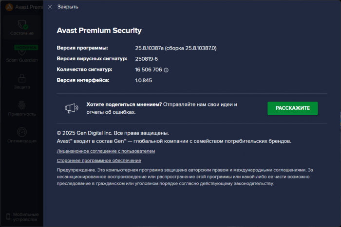 Скачать программу Avast Premium Security 25.8.10387a (784,8 МБ):