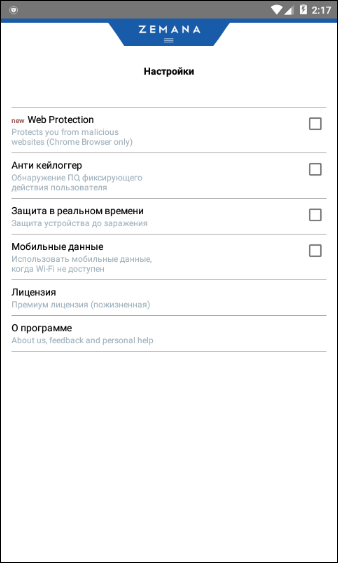 Мобильный антивирус Zemana включает только базовый функционал - антивирусный сканер и анти-кейлоггер. Другие функции и возможности будут появляться по мере выхода новых версий.