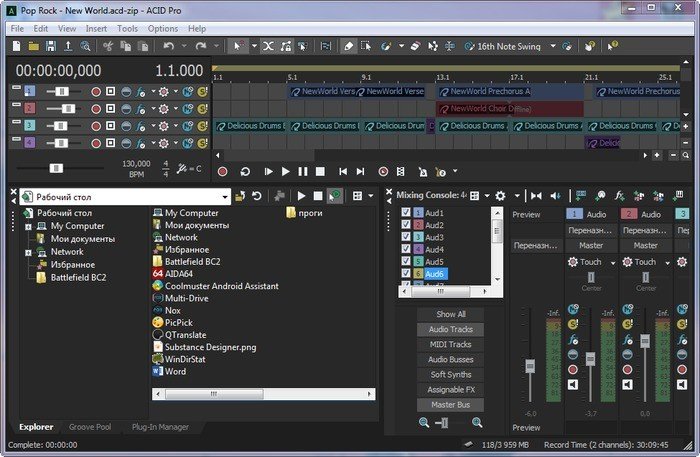 Аудио-эффекты. Используйте нарастающие резонансы, применяйте эффект затухания звука, изменяйте настройки эквалайзера и создавайте собственные аудио-эффекты, с помощью новых автоматизированных средств настройки параметров и управления уровнями. Приложение ACID Pro содержит новые автоматически применяемые эффекты (такие как Resonant Filters, Track EQ и Flange/Wah Wah/Phase). В состав продукта ACID Pro также вошли более 20 аудио-эффектов DirectX (в том числе Amplitude Modulation, Chorus, Delay, Distortion, Flange, Noise Gate, Reverb и многие другие).