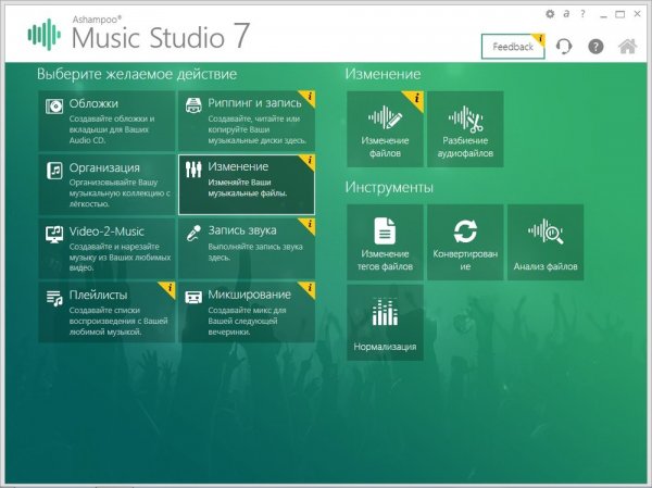 Ashampoo Music Studio - пакет для работы с аудиофайлами. Включает в себя граббер музыкальных дисков, запись CD, DVD и Blu-ray дисков, модуль для организации музыкальных коллекций, редактор аудиофайлов, модуль записи звука, а также инструменты для восстановления поврежденных аудиофайлов.