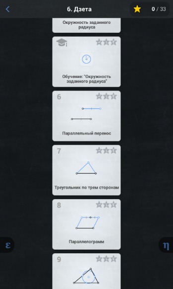 В этой игре вам придется пройти непростой путь, совершенствуясь в геометрических построениях и имея при этом в своем распоряжении только циркуль и линейку. Каждый шаг – это отдельная задача, требующая размышления и подготовки. Вы начинаете с самых основ и, опираясь на уже решенные задачи, постепенно становитесь настоящим мастером, ловко строящим биссектрисы, перпендикуляры, касательные, треугольники по их элементам, вписанные и описанные окружности, золотое сечение и правильные многоугольники. Каждый раз вам предстоит совершить небольшое чудо, создавая новый объект почти из ничего.