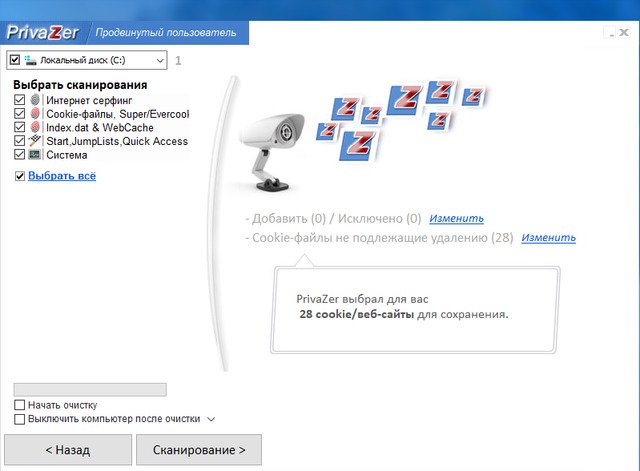 PrivaZer владеет уникальными для подобного класса программ способностями по очистке компьютеров с установленной системой Windows от ненужных файлов. С помощью модуля углубленного сканирования производится поистине полный анализ всей системы, в том числе и вторичных накопителей, внешних дисков а также подключенных к компьютеру накопителей любого вида. Приложение имеет особенный модуль, безвозвратно удаляющий файлы и обратную функцию – восстановление удаленных файлов. При углубленном режиме отображается перечень элементов сканирования. Некоторые папки можно исключить из очистки. Приложение удаляет следы файлов из мастер-таблицы файловой системы, журнала обращений к файловой системе, из Cookies, из файла системного реестра Index.dat, системной истории, истории Интернет-пейджеров, диспетчеров загрузки а также многих других компонентов системы. Приложение имеет возможность выполнить полное стирание файлов с накопителя без остатка а также возможности восстановления. Несмотря на великое количество подобных программ, этот пакет является одним из лучших в своем классе.