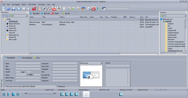 Zortam Mp3 Media Studio Pro - функциональный набор инструментов для работы с MP3 файлами. В программу входит органайзер MP3-файлов, CD-риппер, модуль для работы с базами CDDB. Программа обладает удобным интерфейсом, позволяющим без труда добавлять, сортировать и просматривать сведения о большом количестве музыкальных композиций. Zortam MP3 Media Studio способна редактировать ID3-тэги, обрабатывать сразу большое количество файлов, осуществлять пакетную нормализацию звука, конвертировать файлы MP3 и WAV, управлять плейлистами, удалять, копировать и переименовывать MP3-файлы и многое-многое другое.