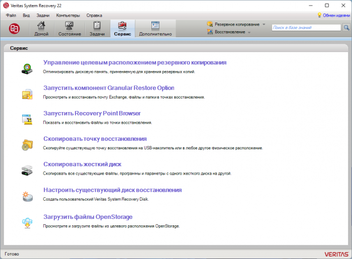 Veritas System Recovery комплексное решение для резервного копирования и восстановления виртуальных или физических систем. System Recovery обеспечивает всестороннюю защиту данных на диске или ленте, и гарантирует восстановление данных и систем вне зависимости от того, расположены ли данные на файловом сервере Windows, настольном компьютере, виртуальном сервере либо сервере важных приложений, таких как Exchange, SQL или SharePoint.