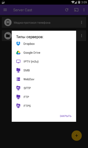 Server Cast позволит вам передавать видео на различные устройства, такие как Chromecast, Smart TV, Fire TV, DLNA, Airplay (Apple TV), XBox и другие, из многочисленных источников, таких как локальные файлы вашего телефона или планшета, DLNA/UPnP, FTP, FTPS, Dropbox, Google Drive, WebDav, SFTP, списки воспроизведения M3U IPTV.