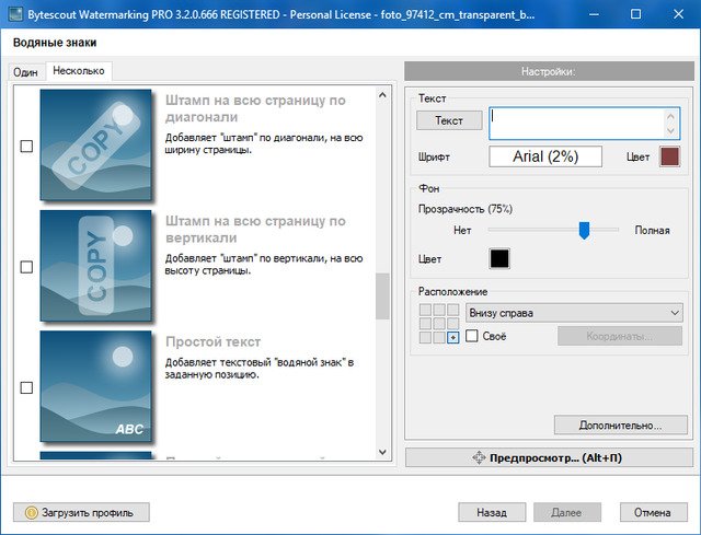 Применение одного или нескольких водяных знаков Bytescout Watermarking PRO позволяет применять один предварительный набор штампов, состоящий из строки текста, текущей даты, имени файла или пользовательского изображения.