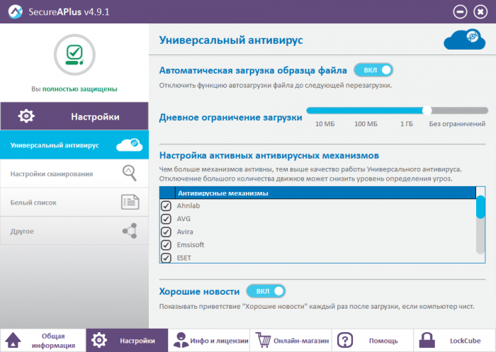 SecureAPlus — решение безопасности, которое сочетает в себе антивирус и возможности применения белого списка для приложений. Антивирус защищает компьютер от известных вредоносных программ, в то время как белый список обеспечивает проактивную защиту от неизвестных угроз.