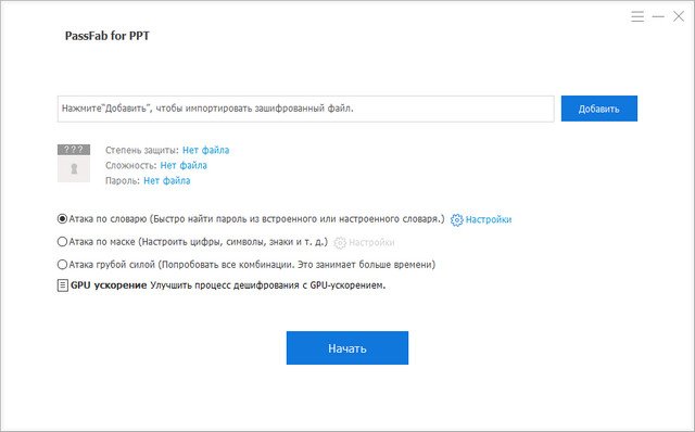 Восстановление с помощью GPU ускоренияВосстановите пароль документов с высокой скоростью, используя расширенную технологию SSE и новый алгоритм поиска. Кроме того, он позволяет ускорить скорость восстановления пароля документов с помощью многоядерных процессоров, графических процессоров NVIDIA CUDA и графических процессоров ATI OpenCL.