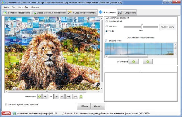 Уникальность программы в том, что в зависимости от особенностей отдельных участков базового изображения в фотоколлаже используются элементы разного размера. Основное изображение воспринимается с детализацией в тех областях, где это необходимо. Такой прием позволяет сделать итоговый коллаж более четким и объемным. Artensoft Photo Collage Maker строит фотоколлажи автоматически! От Вас требуется минимум усилий!