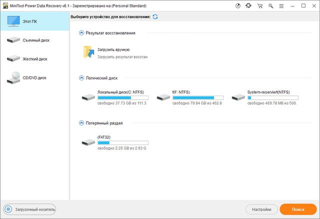 MiniTool Power Data Recovery — отличное средство для восстановления данных с жестких дисков, SD, Smartmedia, Compact Flash, Memory Stick и других носителей. Power Data Recovery восстанавливает файлы и данные, потерянные в результате случайного удаления, форматирования, атаки вирусов, проблем при создании разделов или загрузке, неправильного выключения компьютера, форматирования носителя данных или применения на нём программы FDISK, повреждения загрузочного сектора MBR и т.д.