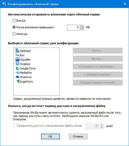Воспользуйтесь облачным хранилищемВаши файлы все еще слишком велики для отправки электронной почтой? Courier автоматически загрузит их в одно из подключенных облачных хранилищ и добавит ссылку на них в исходящее сообщение электронной почты. Courier работает с ZipShare (службой обмена файлами WinZip), Box, OneDrive, Dropbox, Google Drive, CloudMe, SugarSync и MediaFire.