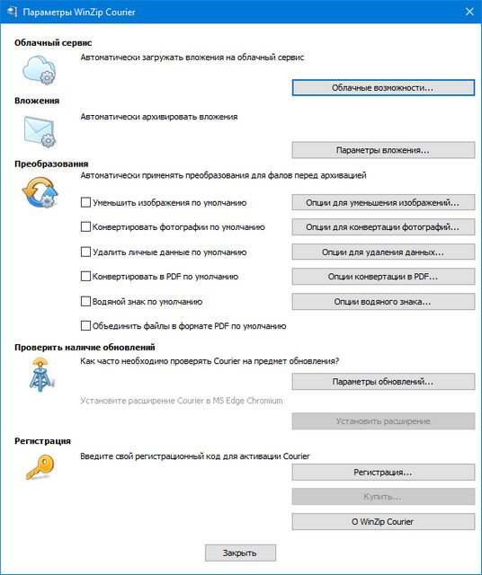 Интеграция с бесплатной службой ZipShareCourier 9 напрямую интегрируется с ZipShare (службой обмена файлами WinZip), автоматически загружает сжатый файл и добавляет ссылку на него в исходящее сообщение электронной почты.