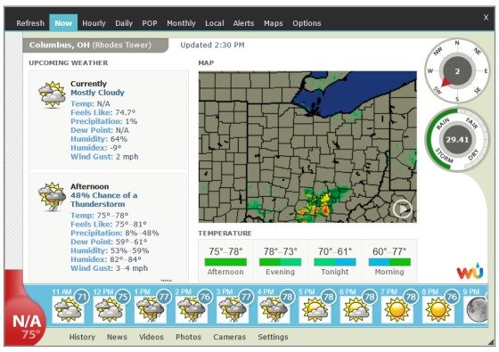 Weather Watcher Live – программа, представляющая собой портативную Windows–метеостанцию, работающую в реальном времени. Программа выполняет основные метеофункции, такие, как прогноз погоды на ближайший час, неделю, месяц. Также присутствует оповещатель, который предупредит вас о ближайших изменениях погоды. Программа имеет навигационную карту мира, в базе которой учтены тысячи городов по всему миру. Четко сбалансированный интерфейс позволяет управлять программой и получать всю нужную информацию несколькими нажатиями кнопок мыши. Уникальность программы проявляется еще и в том, что она создает обои, отображающие полную информацию в реальном времени о погоде в любом городе.