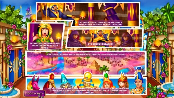 Остановите коварные замыслы злого фараона, прежде чем ваш город будет уничтожен в этом захватывающем приключении "три в ряд"! Тутмос приводит в действие свой план получения бессмертия, произнеся заклятие, которое высвобождает смертельную чуму. И вам предстоит спасти своих людей, уничтожив алтари, поддерживающие заклинание фараона.