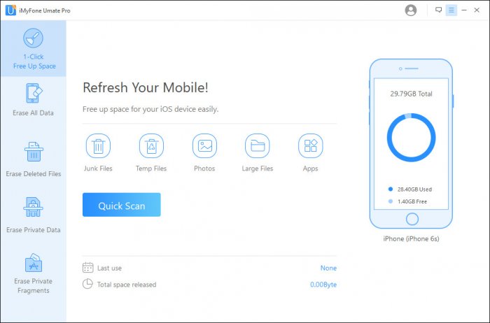 Umate Pro – это надежная программа для очистки iPhone/iPad/iPod Touch от ненужных файлов, очистки временных файлов, сжатия без потерь фото, удаления больших файлов и управлением приложениями.