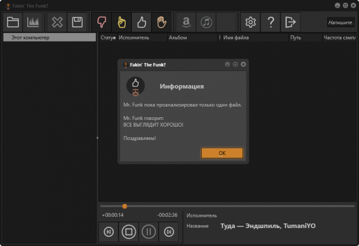 Fakin 'The Funk? это инструмент, который поможет вам определить истинное качество ваших аудиофайлов. В настоящее время вы можете загружать мелодии из любого места. Но каково реальное качество этих файлов? Что делать, если вы могли бы проверить эти мелодии, чтобы убедиться, что они действительно такие хорошие, а не масштабированные c 128kbps до 320kbps.