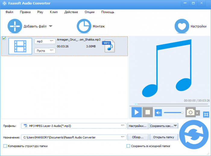 • Faasoft Audio Converter считается удобным MP3 конвертером, который трансформирует треки в mp3 формате на файлы в WMA, M4A, AAC-расширениях;