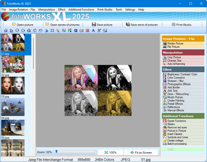 FotoWorks XL — комплексный инструмент для редактирования и преобразования фотографий, имеющий множество функций, которые легко управляемы и предоставляют богатые возможности для редактирования изображений, а также эффекты, различные функции печати, пакетную обработку и многое другое.