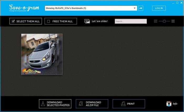 Варианты загрузки нескольких изображений: Найдя учетную запись, из которой вы хотите сохранить фотографии, вы выбираете, как их получить. Вы можете использовать функцию «выбрать их все» или выбрать отдельные фотографии для загрузки только своих избранных. Вы можете сохранить файлы в формате ZIP или распечатать их прямо из приложения.
