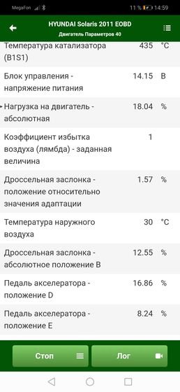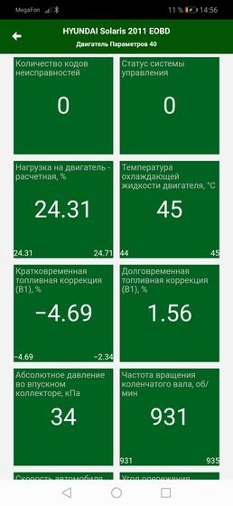 • чтение параметров работы двигателя и автомобиля в реальном времени: скорость, обороты, температура, давление, кислородный датчик, кратковременная и долговременная коррекции и другие параметры, доступные по стандарту OBD II (обычно не требуется знать крутящий момент Torque, но нужно знать значения температуры, чтобы предотвратить перегрев двигателя или трансмиссии и избежать дорогостоящего ремонта)