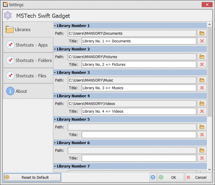 БиблиотекиВы можете указать до 10 каталогов, ваши библиотеки в MSTech Swift Gadget щелкните правой кнопкой мыши по меню. Библиотеки помогут вам быстро перенести ваши файлы и папки.