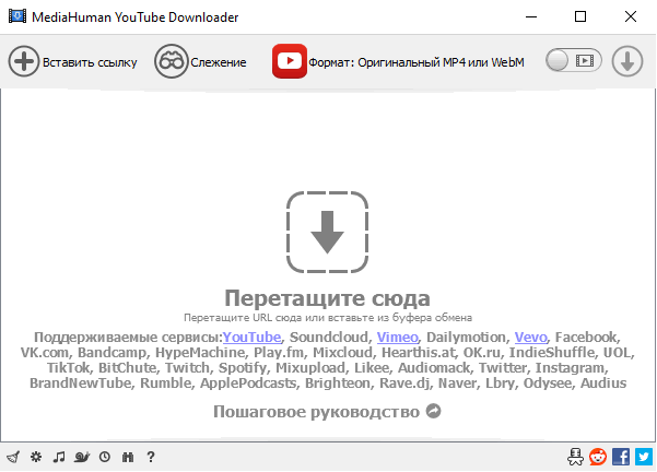 Не только YouTubeПрограмма также поддерживает Vevo.com, Vimeo, Dailymotion, Facebook, ВКонтакте и Soundcloud. Так что вы можете скачивать видео с этих сервисов так же легко, как и с YouTube.