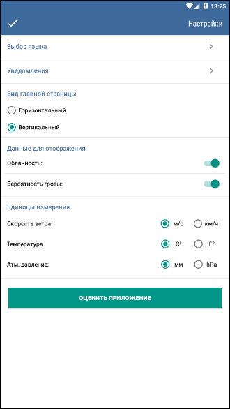 • Возможность настройки интерфейса и погодных данных (показатели / единицы измерения)