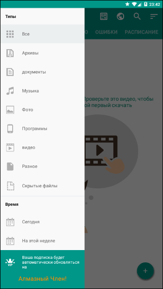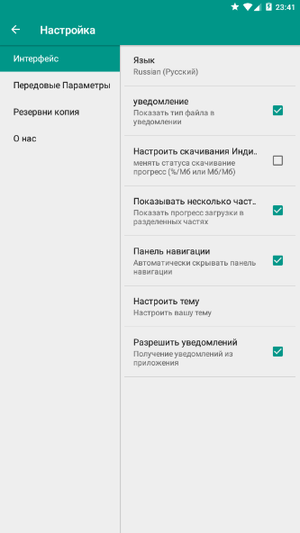 Радует, что в программе есть русский язык, который можно выбрать при первом запуске приложения и после изменить в настройках программы, если это вдруг вам потребуется сделать. Меню приложения выполнено в лаконичном стиле и предлагает вполне понятные пункты и функции, разобраться с которыми не составит никакого труда. Процесс загрузки файлов достаточно быстрый, поэтому можете ставить сразу несколько файлов, а если нужно включить уведомление о совершенных загрузках, к примеру, в тот момент, когда вы сидите в социальной сети или играете в игру, то можно настроить данный параметр в основных настройках приложения, что в разы упростит слежение за скачиванием файлов, к тому же можно включить вибрацию.