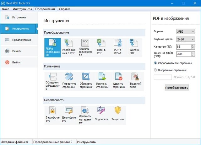 Best PDF Tools - это универсальное программное обеспечение для преобразования, обработки, оптимизации и модификации PDF. Программа позволяет конвертировать популярные форматы файлов в PDF и наоборот; объединить или разделить файлы PDF. Вы можете изменить структуру страницы, добавить водяные знаки, обрезать, извлечь или удалить выбранные страницы. Есть также несколько инструментов для шифрования PDF, подписи и защиты.