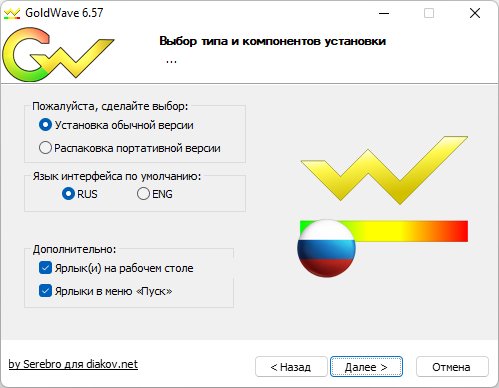 • Также возможен выбор каталога для установки: После всех ключей необходимо добавить /D=%путь% Пример: файл_установки.exe /S /I /D=C:\GoldWave