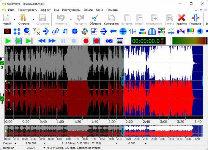 GoldWave - очень мощный звуковой редактор, предназначенный для проигрывания, редактирования, смешивания и анализа звуковых файлов. Умеет быстро работать с большими файлами. Имеет много разных эффектов. Понимает MP3, WAV, AU, IFF, VOC, SND, MAT, AIFF, raw, data, а также множество прочих форматов. Умеет конвертировать из одного формата в другой. С помощью GoldWave можно применять всевозможные эффекты (добавлять эхо, эффект "постепенного исчезания" звука (Fade), редактировать эквалайзером и пр.) убирать шумы, реставрировать старые записи и т.д. GoldWave позволяет записывать звук с кассет, пластинок, радио, а также с микрофона. Инструмент CD Reader дает возможность делать точные копии треков аудиодисков.