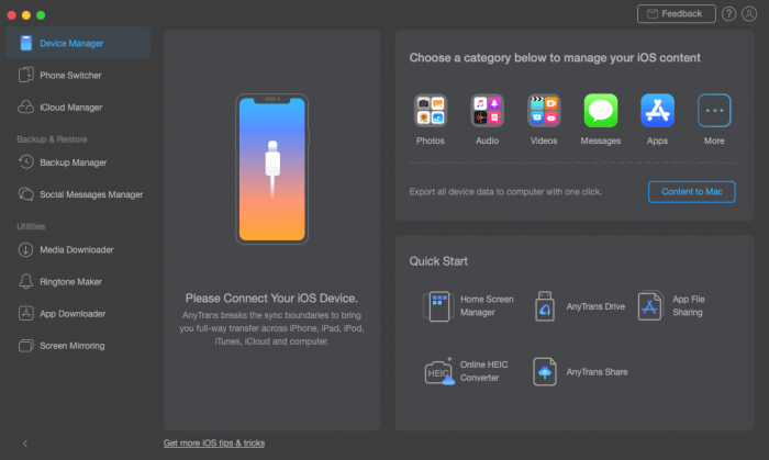 AnyTrans - это менеджер iPhone, который нарушает границы синхронизации и объединяет каждый доступ ко всему вашему контенту в одном месте, включая музыку, видео, фотографии, сообщения, книги, историю Safari, голосовые заметки и т.д.