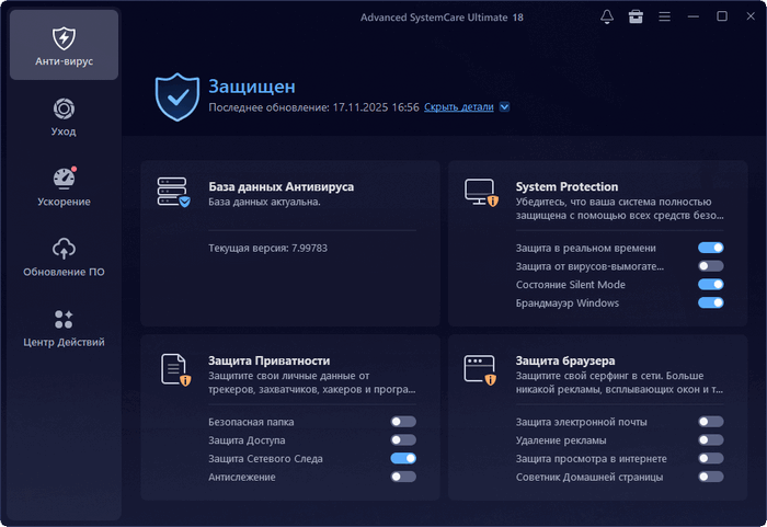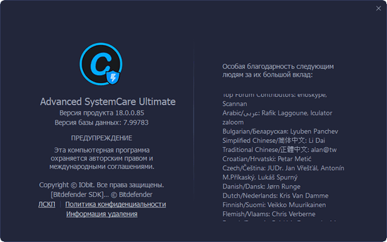 Advanced SystemCare Ultimate - комплексная забота о состоянии вашего компьютера. Антивирус с движком Bitdefender, защита от вредоносных сайтов и загрузок, монитор ресурсов и различные инструменты для оптимизации и настройки системы Windows.