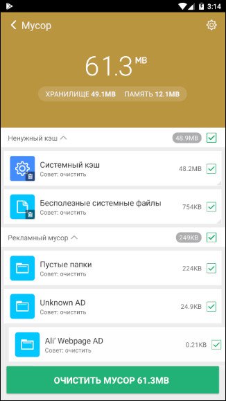 • Деинсталлятор Clean Master улучшен по сравнению с данным компонентом по умолчанию в Android, и в состоянии создавать даже резервные копии .apk файлов. Root-пользователи могут перемещать приложения на SD-карту, а также удалять предварительно установленные и системные приложения.