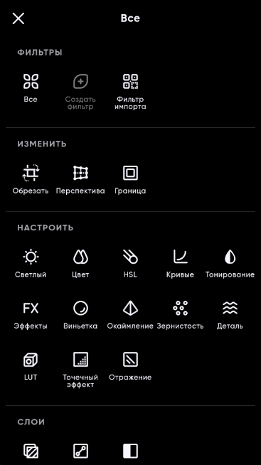 • Общие настройки: свет, цвет, HSL, тонирование, эффекты, окантовка, детали, кривые, виньетка, зернистость, LUT.