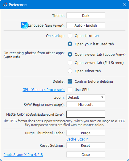 Демонстрацию результатов обработки упрощает возможность просмотра оригинала изображения в один клик на любом из этапов работы над ним. При сохранении обработанного изображения PhotoScape X Pro автоматически создаёт резервную копию оригинальной фотографии и сохраняет метаданные (отключается в настройках). Заявлена разработчиками и поддержка RAW.