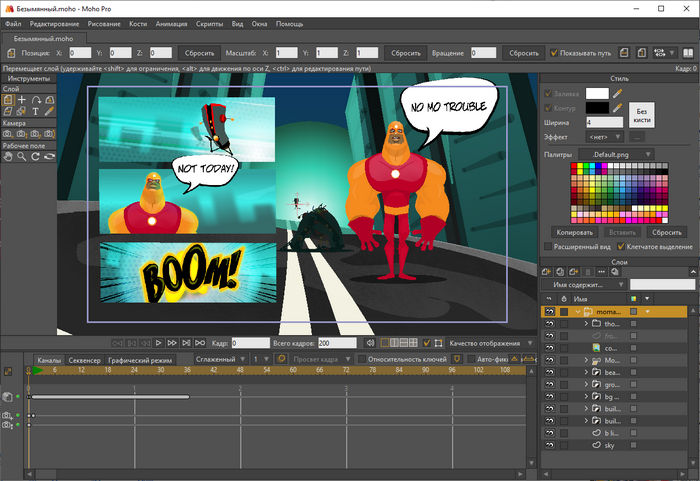 Moho Pro - профессиональная версия одной из лучших программ для создания качественной 2D анимации. Данная программа идеально подходит для профессионалов, ищущих более эффективную альтернативу для создания анимации без утомительной детальной покадровой обработки. С интуитивно понятным интерфейсом и библиотекой готовых персонажей и дополнительных объектов (мультипликационные объекты, фоны, картинки и т.д.) программа предоставляет продвинутые анимационные инструменты и эффекты, которые повысят скорость создания анимации.