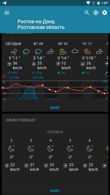 • Прогноз на 10 дней (по дням, по часам) + текстовое описание