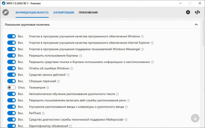 WPD (Windows Privacy Dashboard) - компактный, но мощный портативный инструмент, работающий по Windows API. WPD является удобным и правильным способом для управления параметрами конфиденциальности в Windows.
