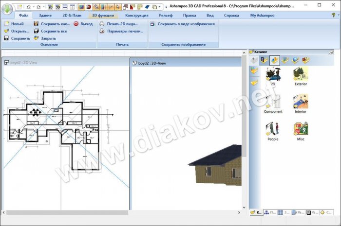 Элементы экстерьера и интерьера уже включеныВстроенный каталог объектов даёт Вам доступ к различным компонентам зданий, текстурам, материалам и символам. Потребует всего один клик, чтобы установить дверь, окно или балкон, парковочное место для автомобиля, а также санитарно-гигиенические и электрические установки в Вашем проекте. Вы можете импортировать дополнительные объекты из SketchUp и Collada. Это даст Вам взглянуть на готовый проект ещё на этапе проектирования - до мельчайшей детали!
