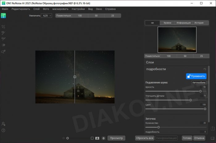 • Авто с предпочтениями пользователя - кнопка Авто проанализирует фотографию и определит правильную величину шумоподавления с использованием моделей AI ON1.