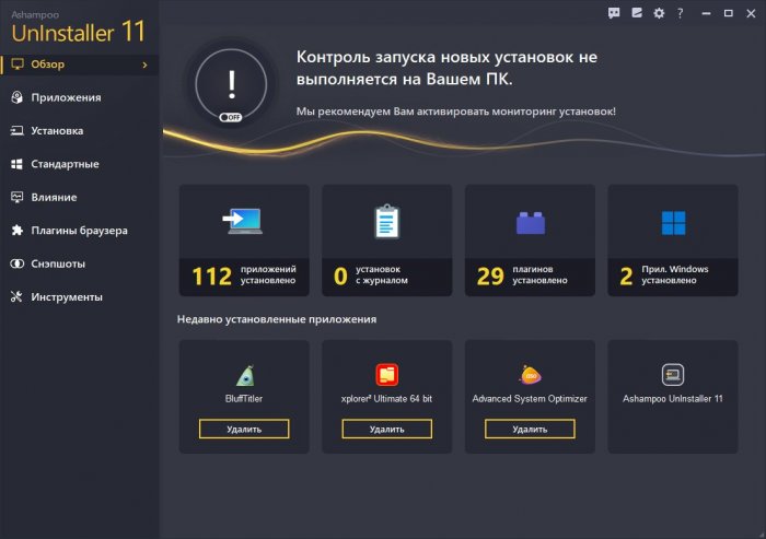 Ashampoo UnInstaller 11 заряжена новыми функциями! Попробуйте новый монитор установок, который обнаруживает практически все установки, так что Вам больше не нужно будет вмешиваться! Наслаждайтесь полной совместимостью с Windows 11, новым Центром загрузки, который поможет Вам выполнить анализ загрузки системы, а также удобным отображением всех Ваших установленных приложений с разделением по категориям! Находите проблемы с производительностью или удаляйте ненужные задачи, и экономьте клики с помощью умных функций. Получайте больше информации с помощью подробных всплывающих подсказок и пользуйтесь множеством изменений, сделанных по запросам пользователей! И последнее, но не менее важное: удаляйте программы с небывалой простотой и ещё тщательнее, чем когда-либо!