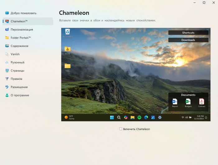 Возможность в полной мере наслаждаться фоновым рисунком Вашего Рабочего стола! Fences позволяет легко скрывать все иконки на рабочем пространстве и также легко и быстро (двойное нажатие левой кнопки мыши) восстанавливать их! Для любителей минимизации элементов рабочего пространства, а также для пользователей, у которых иконки различных приложений загромождают весь Рабочий стол, эта функция станет просто находкой!