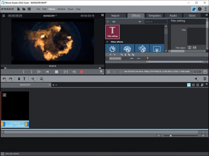 Движок Movie Studio – INFUSION Engine 3. Он позволяет работать плавно в любой ситуации, даже в сложных проектах с большим количеством эффектов и цветокоррекции. Это стало возможным благодаря поддержке GPU для современных видеокарт Intel, NVIDIA и AMD.