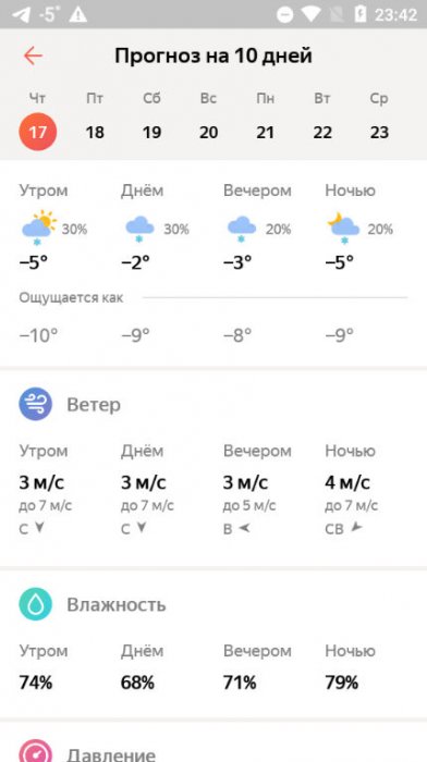 • Если сдвинуть экран вправо, покажутся дополнительные сведения о погоде. Там и информация о ветре, и температура по ощущениям, и давление и влажность, и время восхода и заката солнца.