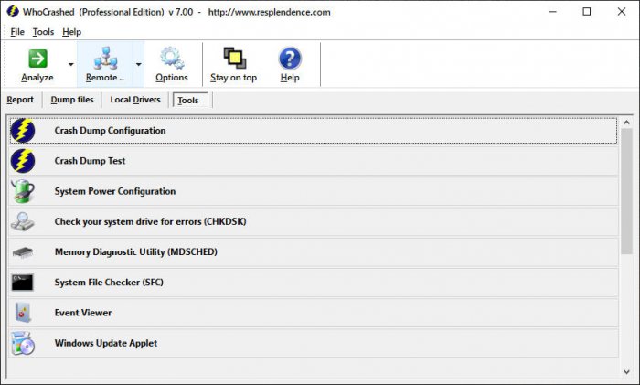 The professional edition of WhoCrashed offers the following additional features:• Crash dump analysis on remote computers on the network