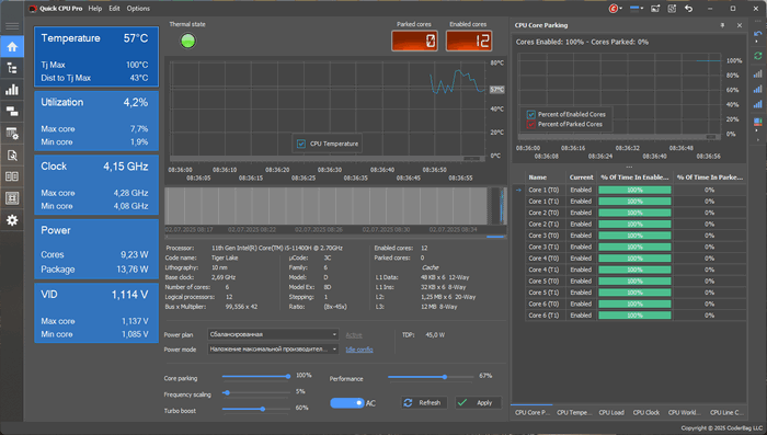 Quick CPU — это приложение, разработанное для точной настройки и мониторинга производительности процессора, параметров питания и напряжения, таких как: парковка ядер, масштабирование частоты, Turbo Boost, C-States, Speed Shift и FIVR Контроль, а также некоторые другие возможности.