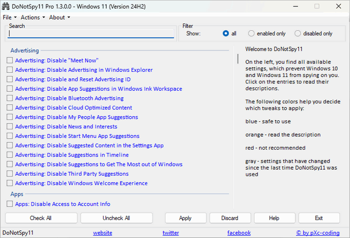 DoNotSpy11 — это обновленный антишпионский инструмент для Windows 10/11. DoNotSpy11 предоставляет настройки, недоступные через приложения Windows, и объединяет их все в одном приложении, чтобы вы могли эффективно защитить свою конфиденциальность.