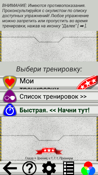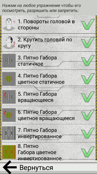 Список готовых тренировок:• Амблиопия (Ленивый глаз) – это гимнастика зрения для коррекции (например, при косоглазии). Используйте ее по согласованию с окулистом!