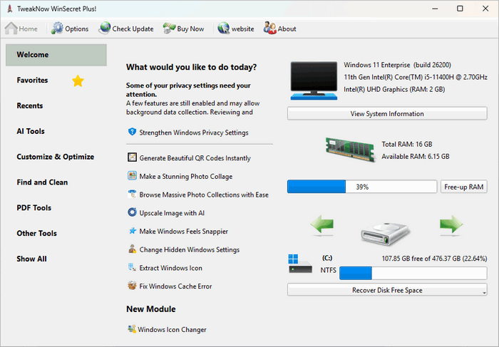 Программа позволяет безопасно изменять скрытые параметры Windows через удобный интерфейс, очищать реестр и следы активности, управлять процессами и приоритетами приложений, находить дубликаты файлов и анализировать использование диска, а также выполнять дополнительные задачи вроде работы с изображениями, PDF и QR-кодами; утилита ориентирована как на обычных пользователей, так и на продвинутых, предлагая быстрый доступ к системной информации, инструментам устранения неполадок и настройкам конфиденциальности.